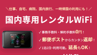 日本国内専用レンタルWiFiとは?日本国内専用レンタルWiFiは、旅行や出張、帰省、イベント参加など、さまざまなシーンで手軽にインターネット環境を整えられるサービスです。スマートフォンの通信制限を気にする必要がなく、高速データ通信を快適に利...
