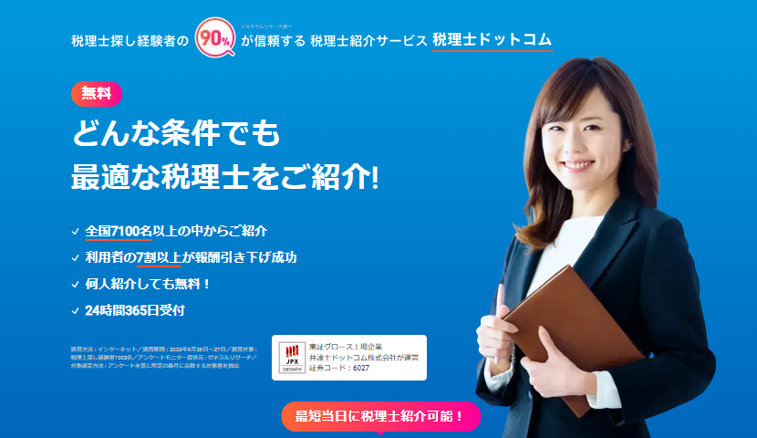 「税理士ドットコム」は、全国の税理士からあなたの希望条件に合う専門家を無料で紹介してくれる、日本最大級の税理士マッチングサービスです。
