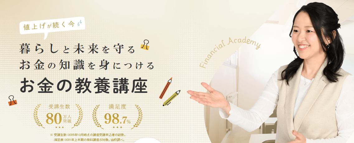 「お金の教養を、すべての人に。」を理念に掲げ、投資・家計管理・副業・ライフプランニングなど、幅広いテーマを学べる講座を提供しています。