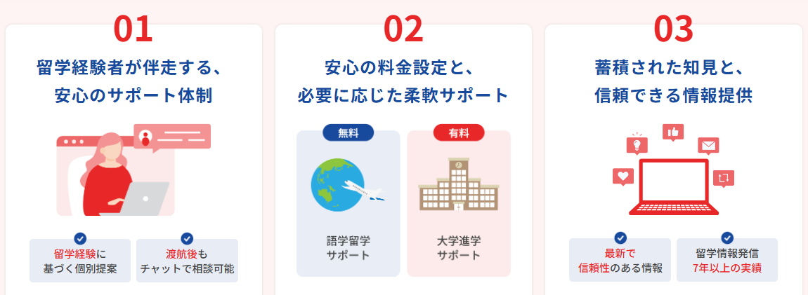 疑問や不安を解消し、自分に合った留学プランを見つけたい方に適したサービスです。