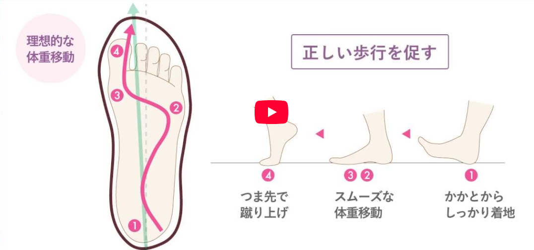 本シューズは歩行性の向上、体幹の安定、転倒予防を目的に設計されています。人間解剖学に基づいたオリジナルの木型を使用し、足に自然にフィットする形状を実現しています。