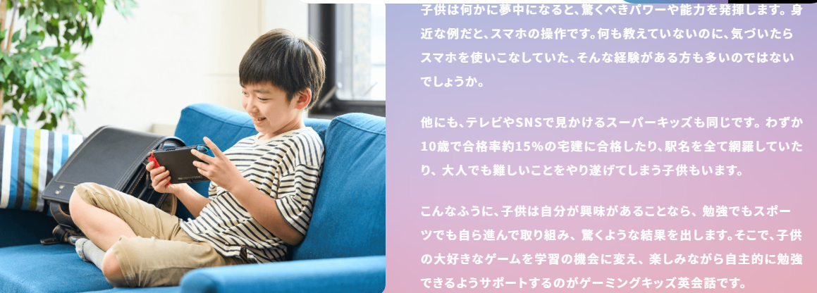 ゲーミングキッズ英会話は、ゲームという身近なツールを活用しながら英語力を伸ばせる新しい学習スタイルです。